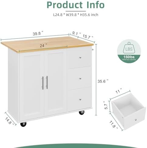 【Your Kitchen Space Saver】This kitchen island features 1 large cabinet and 3 drawers, providing spacious storage space for your kitchen utensils. The cabinet with 2 doors will hide all kinds of kitchen stuff, keep your kitchen always look clean and tidy