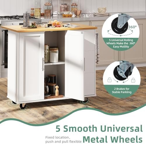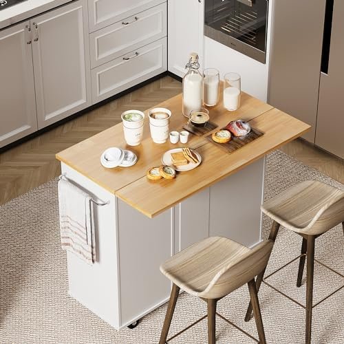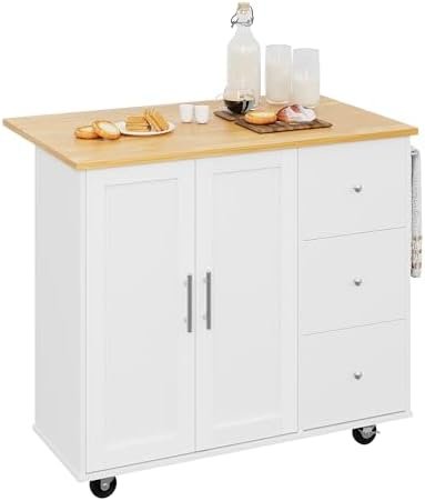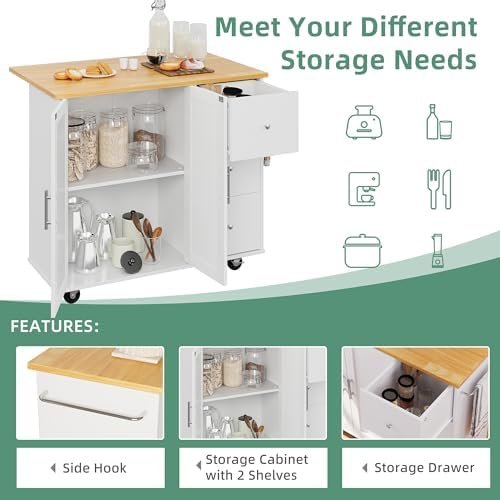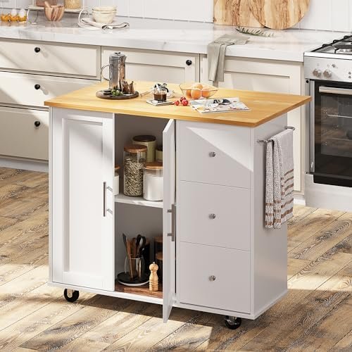 Shintenchi Rolling Kitchen Island Cart with Folding Drop Leaf Breakfast Bar, Portable Trolley Island with Large Storage Cabinet, Shelf and Drawer, White