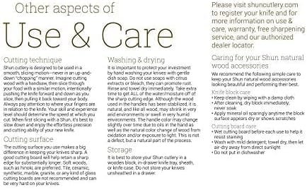 Shun is dedicated to maintaining this ancient tradition by continuing to handcraft each knife in our Seki City facilities. Each piece of this fine kitchen cutlery takes at least 100 individual steps to complete. While we maintain these ancient traditions of handcrafted quality, we also take advantage of thoroughly modern, premium materials and state-of-the-art technology to provide that traditional quality to millions of professional chefs and avid home cooks throughout the world.