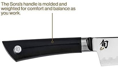 The Sora line features a traditional handle design with textured TPE which provides excellent grip, balance, and easy maintenance. Topped on the end of the handle is the Shun logo in stainless steel which enhances and balances the handle.