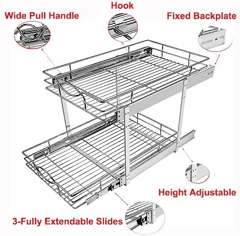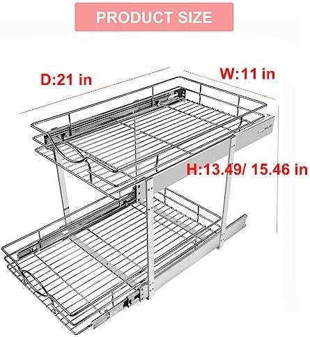 ⛓【Height Adjustable Design】: The upper and lower wire baskets have two height adjustment methods (13.8/15.5 “H), which can easily solve the problem that the lower wire basket can’t be pulled out due to the lip of the cabinet.