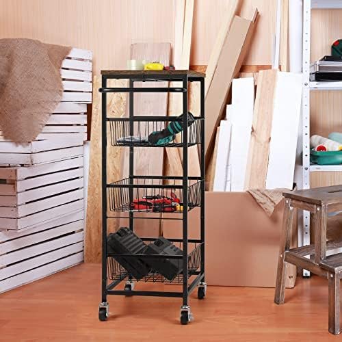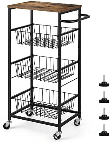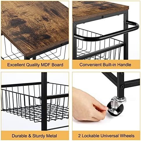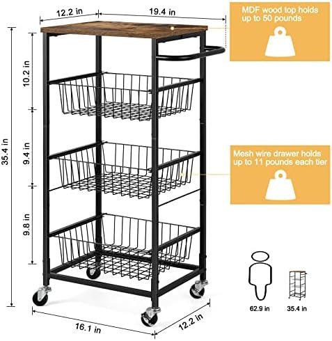 【Durable & Sturdy】Made of excellent vintage style particle board and metal, this kitchen utility cart with storage features durable and strong enough for daily use. MDF wood top can hold up to 50 pounds, and each mesh wire drawer will hold up to 11 pounds.