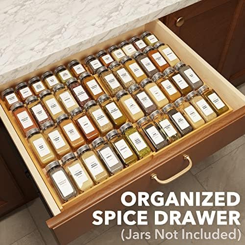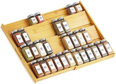 EXPANDABLE DRAWER INSERT – The wooden spice rack is expandable from 12″ to 23″ wide, to fit in different sizes drawers; MAKE SURE YOUR DRAWER IS AT LEAST 3″ HIGH