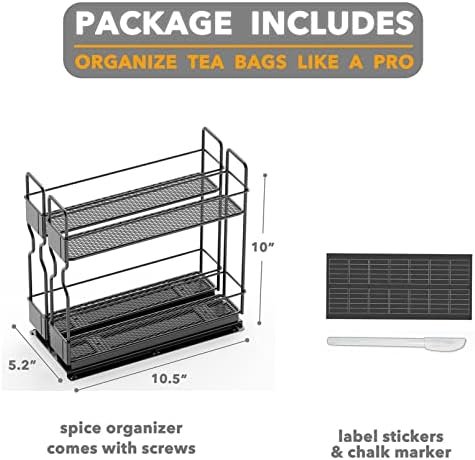 EASY INSTALLATION – It is easy to install by removing the sliding base bottom. This rack needs 5.2″wide x 10.75″deep x 12″high cabinet space with standard spice jars on the upper tier.