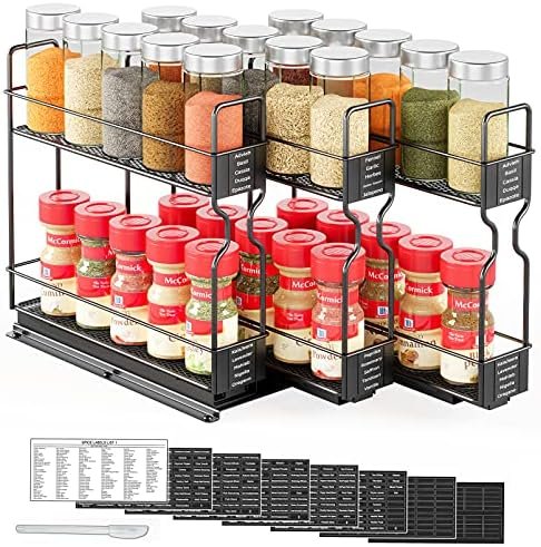 EASY INSTALLATION – It is easy to install by removing the sliding base bottom. This rack needs 7.7″wide x 10.75″deep x 12″high cabinet space with standard spice jars on the upper tier.