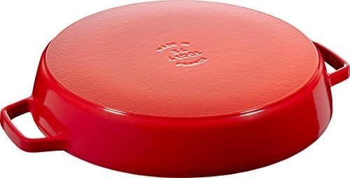 With the large round pan from Staub, novice and professional chefs alike can cook succulent meat and tasty vegetables for their families and guests. The pan’s smooth surface enables quick frying with minimal fat and is easy to clean. The frying pan has two handles and measures 26 cm in diameter. The two compact handles are practical for placing the pan in an oven or on a table. The pan is suitable for any type of cooker. Its cherry-red design adds a splash of colour to any kitchen and table and its form resembles a paella pan – which you can of course also make with it. As well as paella, the pan is ideal for any other recipe requiring quick frying followed by slow cooking. Heat disperses to the pan’s edges so that even when full, the food cooks evenly. The pan can also cope with high oven temperatures and therefore suitable for recipes such as gratins. Tasty vegetable, tender meat and finely cooked fish dishes can be prepared in an instant using the frying pan from Staub.