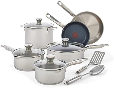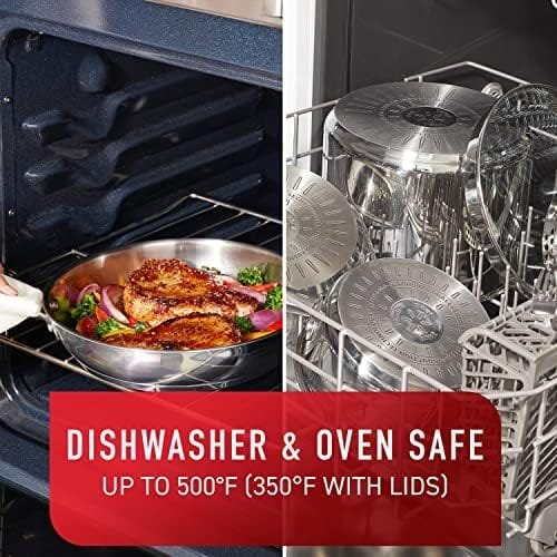 T-fal’s Unlimited Stainless Steel Collection is 10x more resistant vs. T-fal basic coatings. Equipped with a unique Thermo-Spot heat indicator, you’ll know exactly when your cookware has reached the ideal cooking temperature to bring out your food’s flavor. Its versatile, even heat base prevents hotspots and cooks every bite uniformly, and is compatible with all stovetops, including induction. Set includes 3.5qt Covered Deep Saute, 10.25″ Frypan, 8″ Frypan with Platinum Non-Stick Coating, 1.5qt Covered Saucepan, 2qt Covered Saucepan, 6.3qt Covered Dutch Oven, and 2 Metal Tools