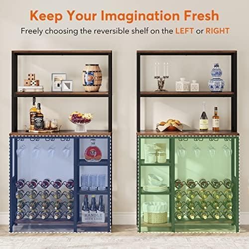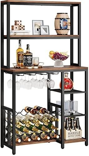【Lots of Available Storage Area】:This Tribesigns wine rack is composed of 1 upper hutch,1 wine rack for liquor storage and 3-tier layers.4 glass holders and 20 bottles storage are perfect for fitting wine, bottles, glass. Open shelves are adopted to hold your microwave oven, wine buckets, coffee maker, kitchen essentials, daily-used items like cups,baskets and so on.Just buy a rack? Absolutely not! You will be an owner of large space!