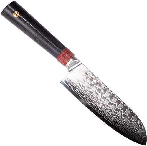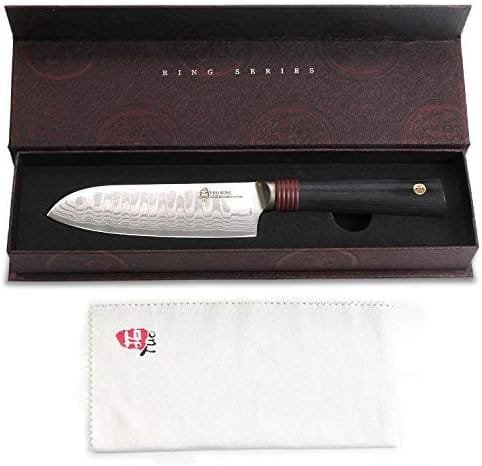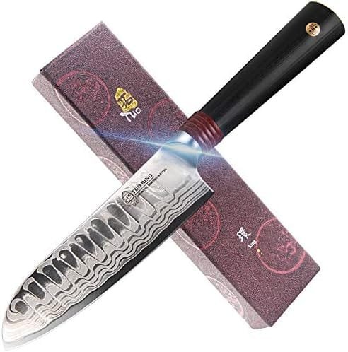 *FORGED JAPANESE AUS10 DAMASCUS STEEL:TUO Damascus Japanese style santoku knives are made from high quality forged Japanese AUS-10 Damascus high carbon stainless steel with 67 layers in total. The hardness of the blade could be up to 62HRC after our advanced vacuum heated treatment and cooling treatment. Chef knife blade is extremely corrosion and rust resistance, long-lasting edge, excellent toughness and ultra sharp.