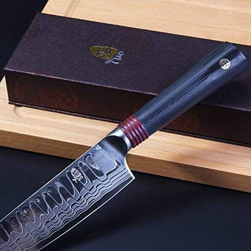 *DISHWASHER SAFE G10 HANDLE: G10 is kind of high density glass fiber which can withstand super high pressure without deformation, crack. It’s characters including insulation, anti-corrosion, wear-resisting, anti-acid and alkalis, heat-resistance, cold-resistance. Those advantages make this Damascus Santoku Knife to be dishwasher safe.