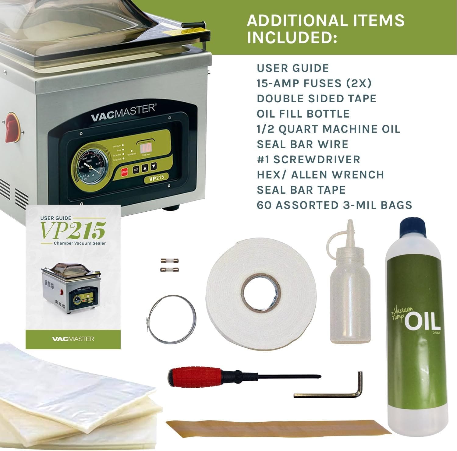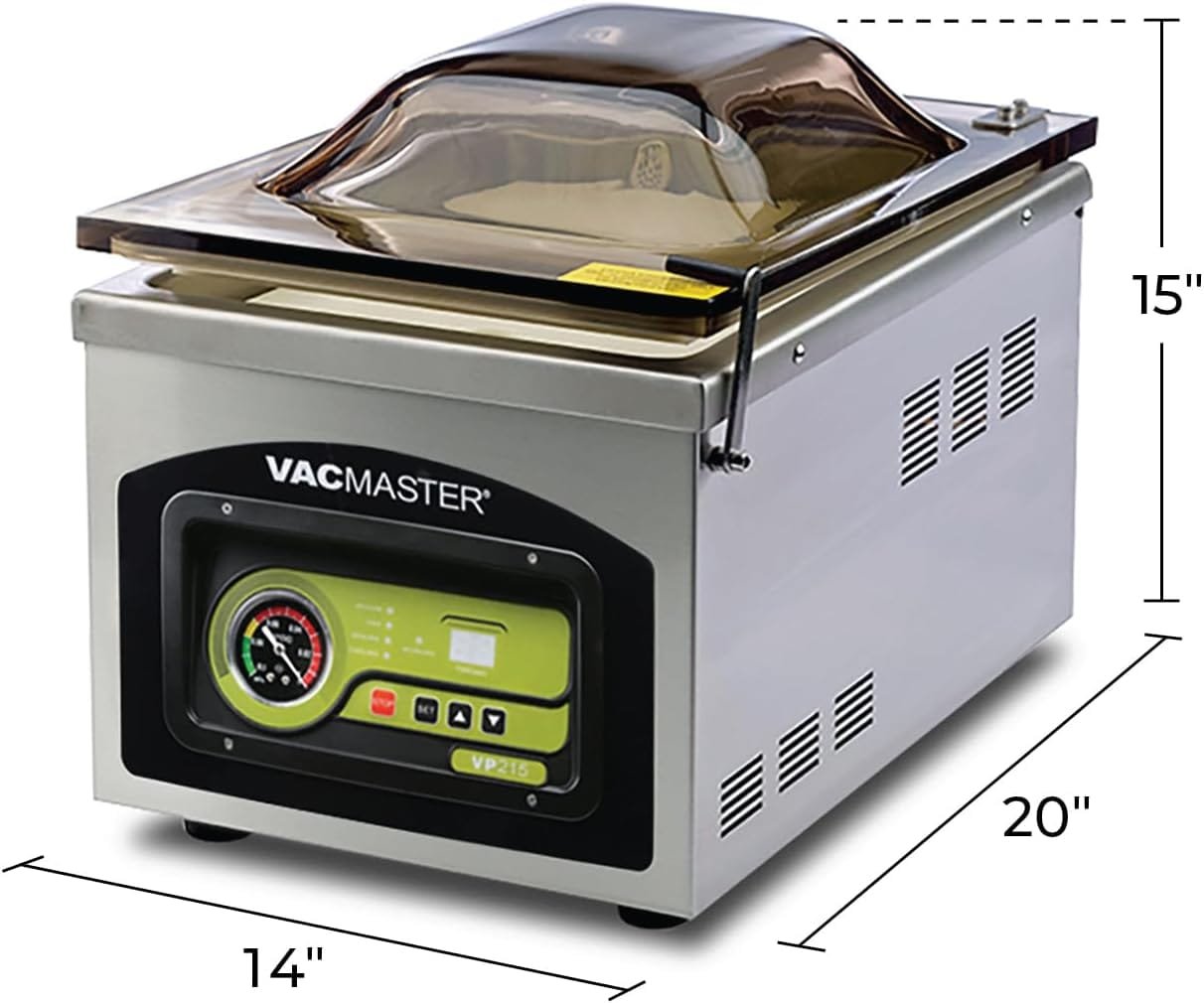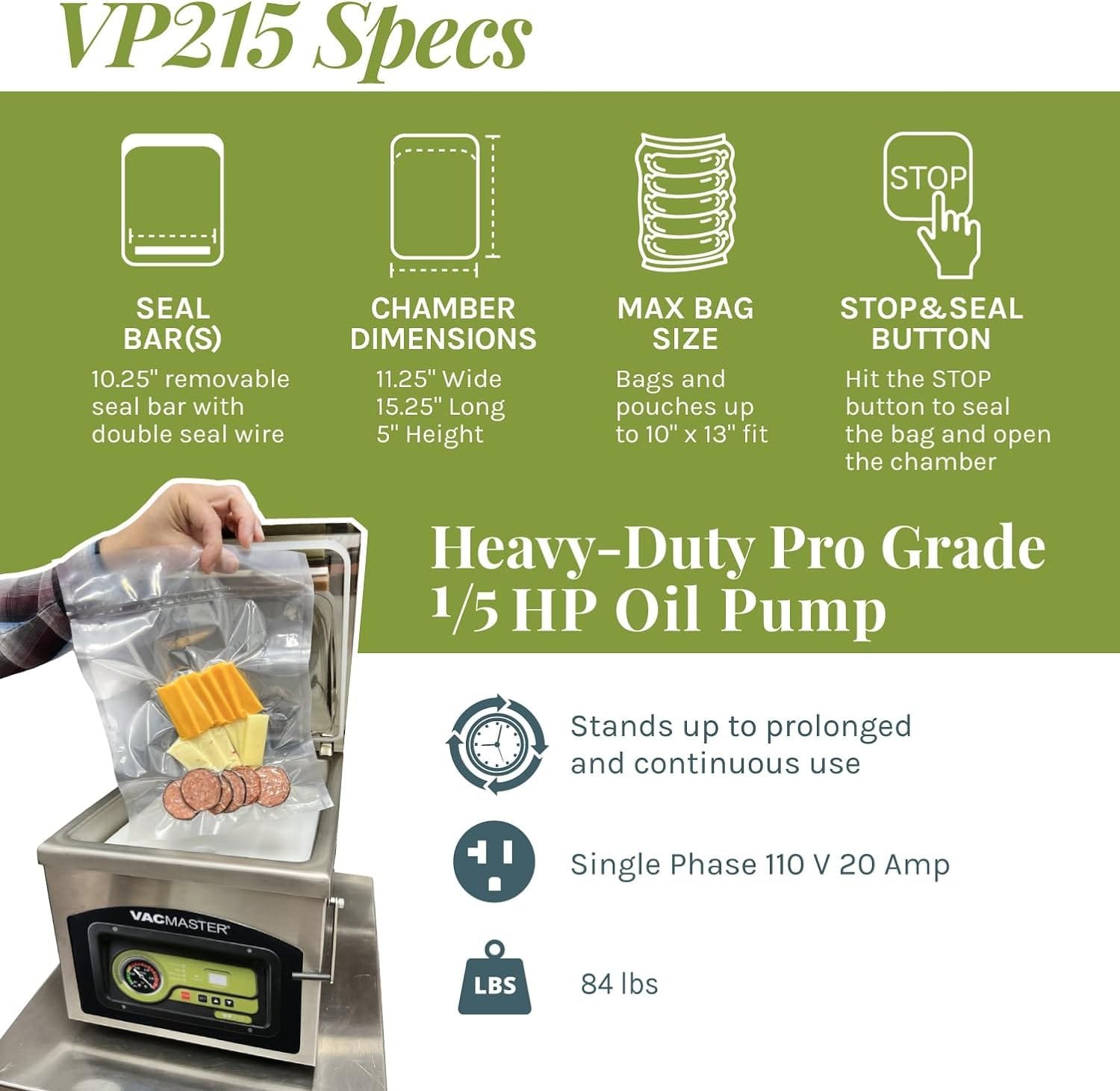 VacMaster VP215 Specifications – Overall Dimensions (WxDxH): 14” x 20” x 15” | Chamber Size (WxDxH): 11.25” x 15.25” x 5” | Seal Bar Size 10.25” | Maximum Bag Size 10” x 13 | Pump: Heavy-Duty 1/5 HP Oil Pump |Weight: 84 lbs.