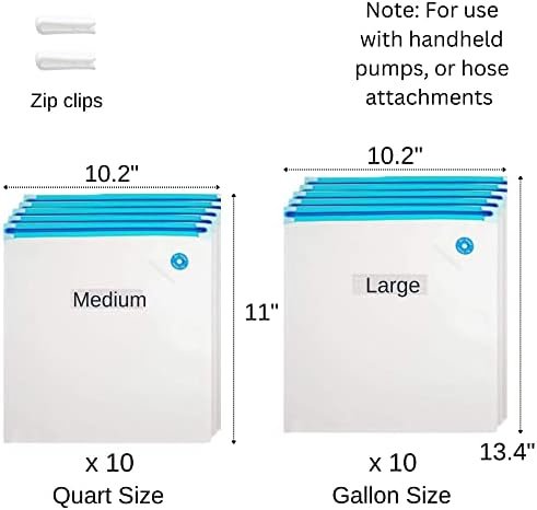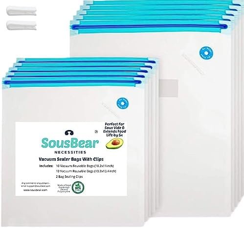THIS KIT CONTAINS: 10 of Quart Size Bags (11.0″ x 10.2″), 10 of Gallon Size Bags (10.2″x13.4″) (1.06 US GAL) & 2 sous vide bag sealing clips
