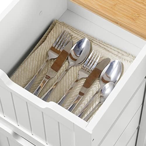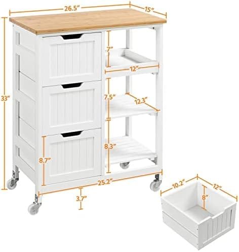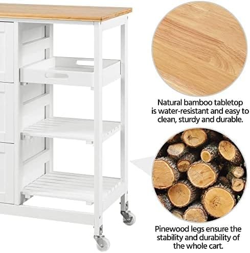 【Durable kitchen cart】This practical kitchen cart is mainly composed of CARB P2-compliant MDF cart, durable bamboo top and pinewood legs, it boasts durability and can totally hold up to 75kg/165lb. The powder-coated surface is smooth and easy to clean. The bamboo countertop with powder coating surface ensures its high strength and good maneuverability.