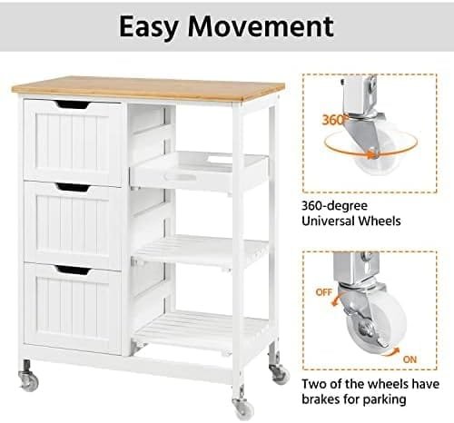 【Must-have mobility】Stands on four universal wheels (2 with brakes), this rolling kitchen island boasts super convenience and effortless maneuverability and can lock into place if needed.